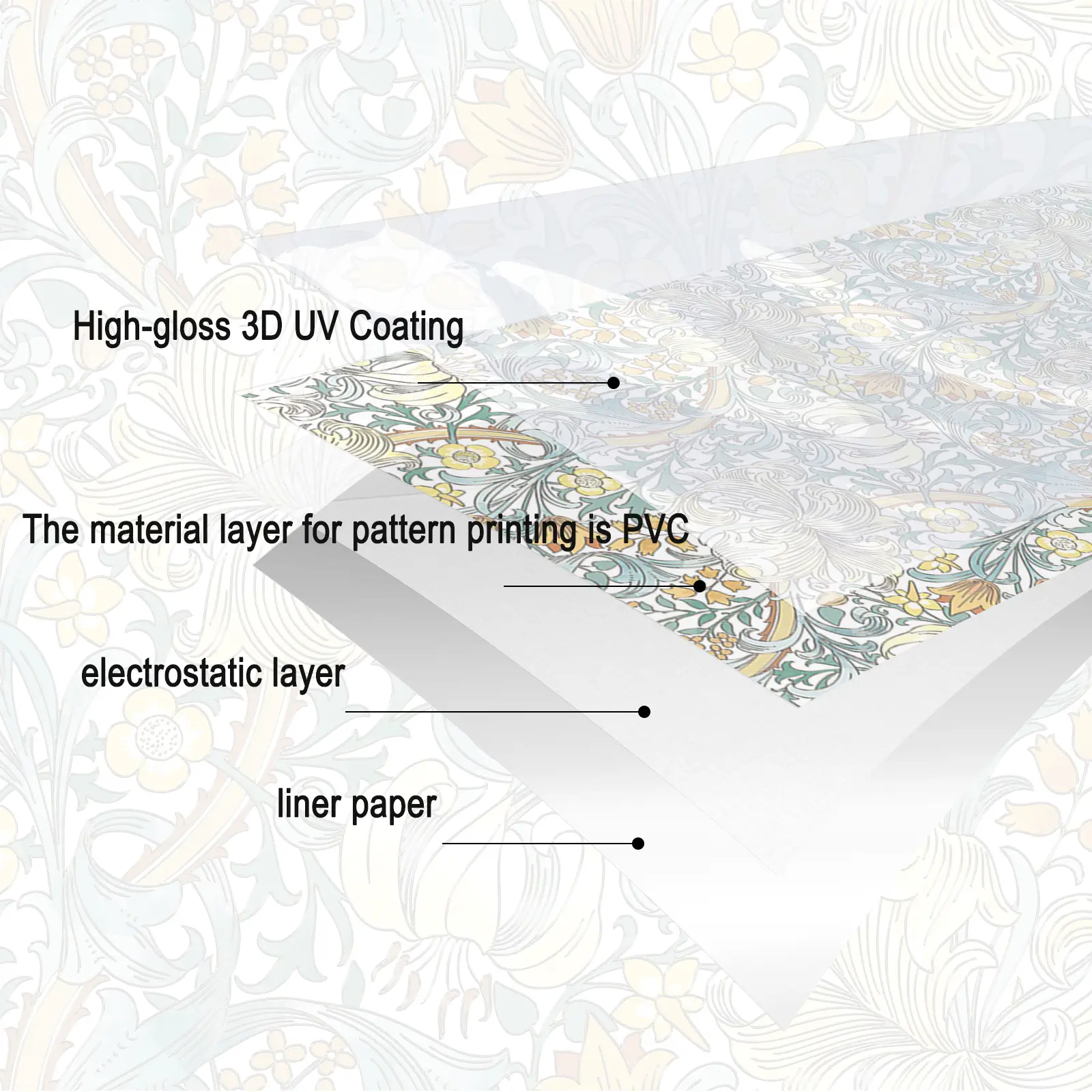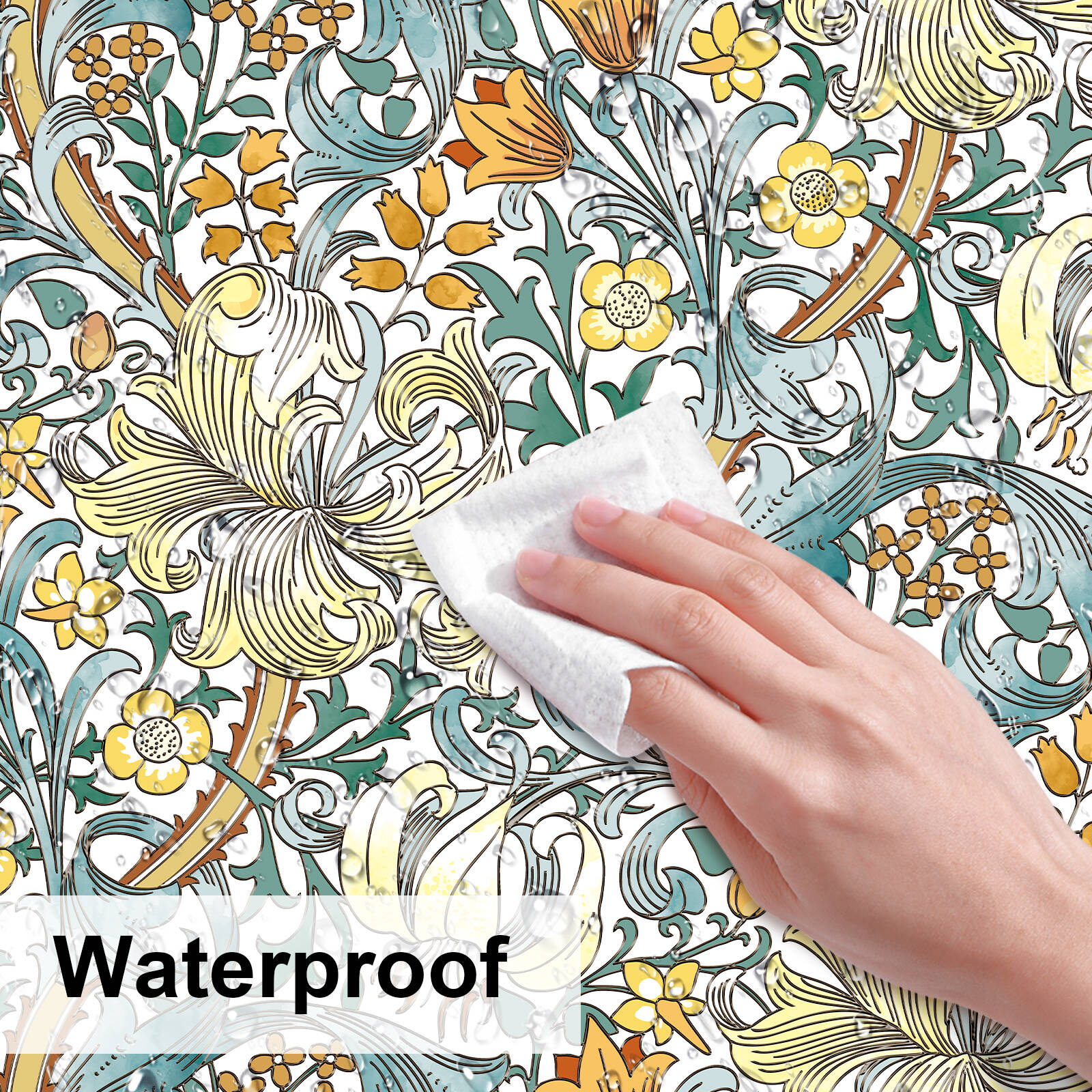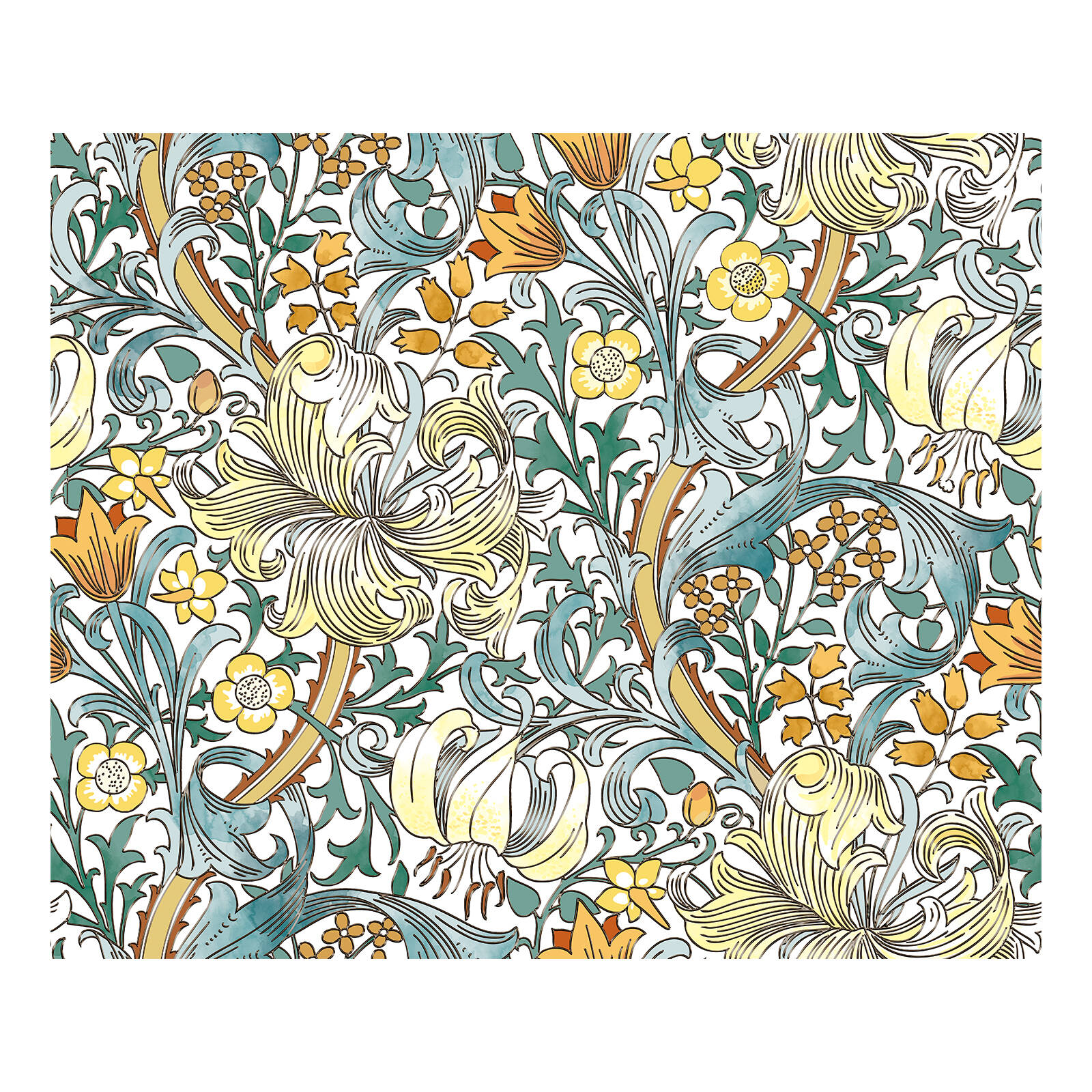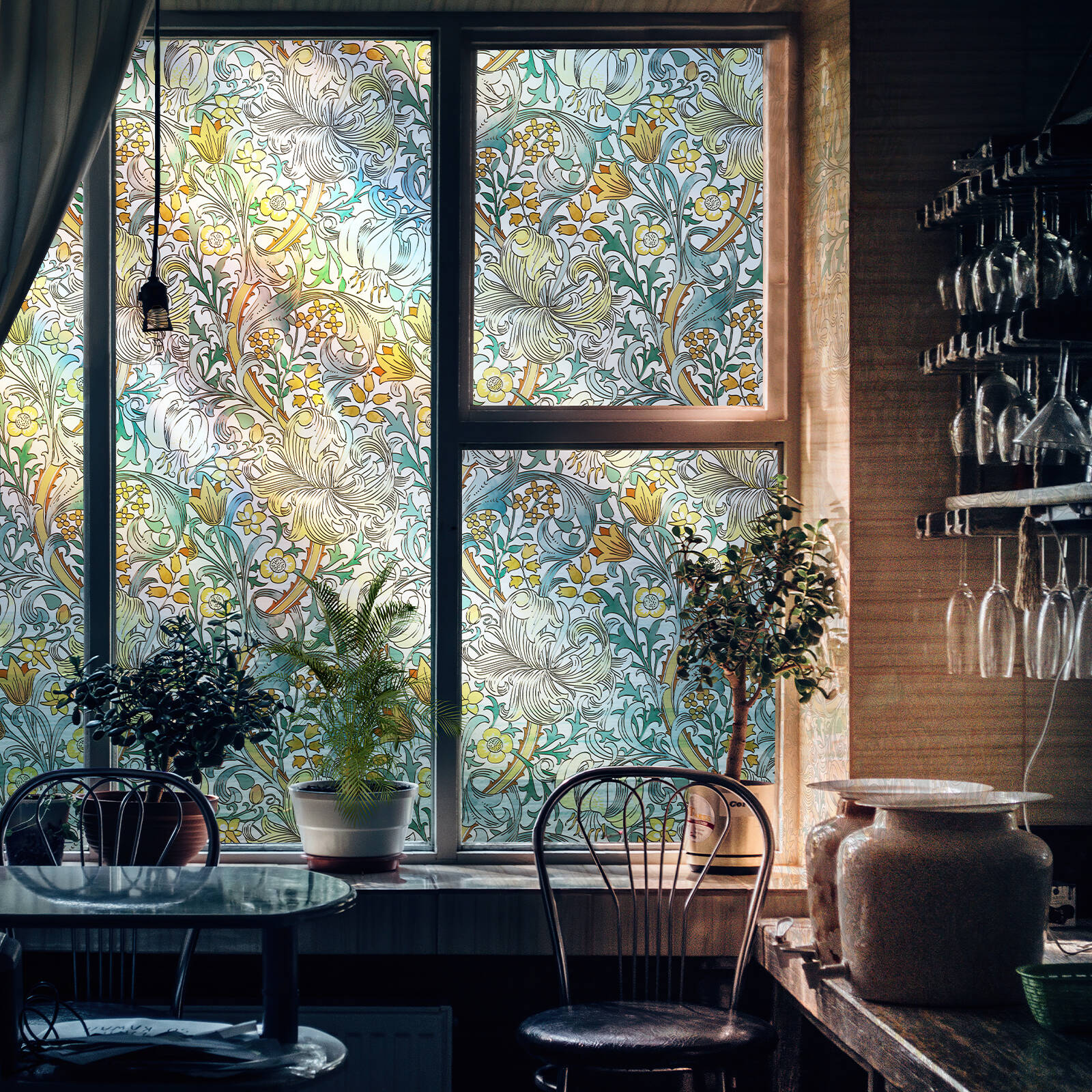 Made of high-quality textured PVC with a static cling backing (no adhesive), this decorative window film features a classic Morris-style floral artwork with golden lily details, creating a stained-glass effect with crafted texture that adds visual depth and softens direct glare.Full Ingredient List: Textured PVC.